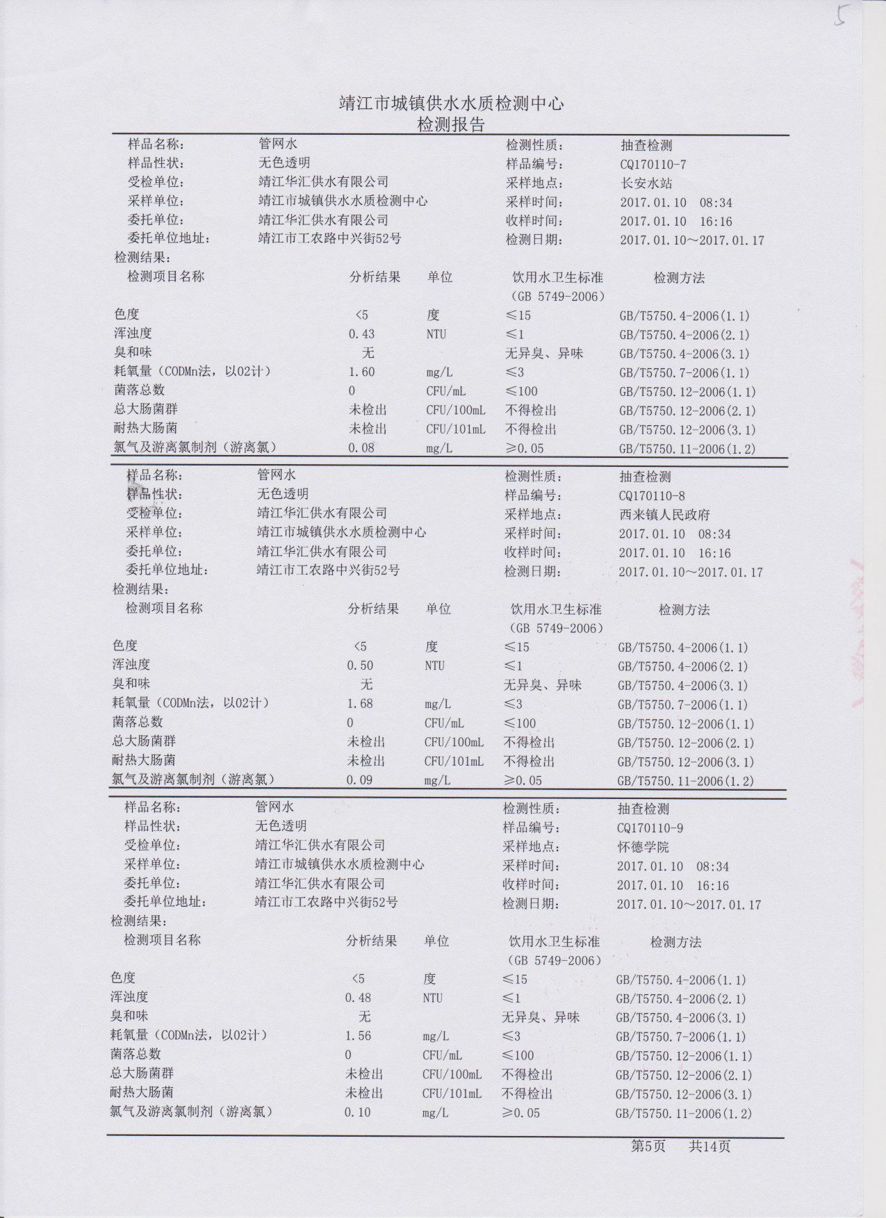 管網(wǎng)水質(zhì)檢測報告2017.01.10