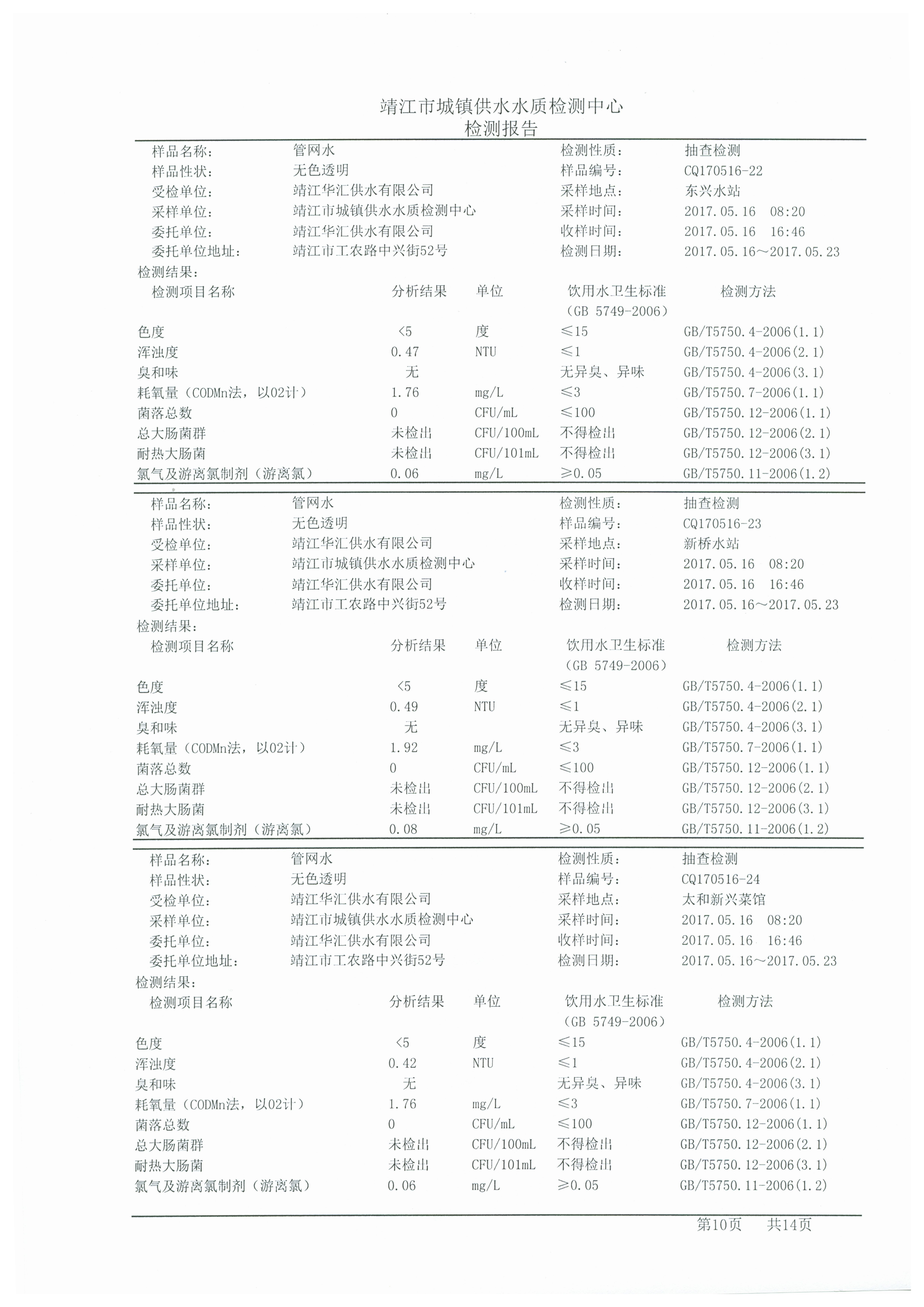 管網(wǎng)水質(zhì)檢測報告2017.05.16
