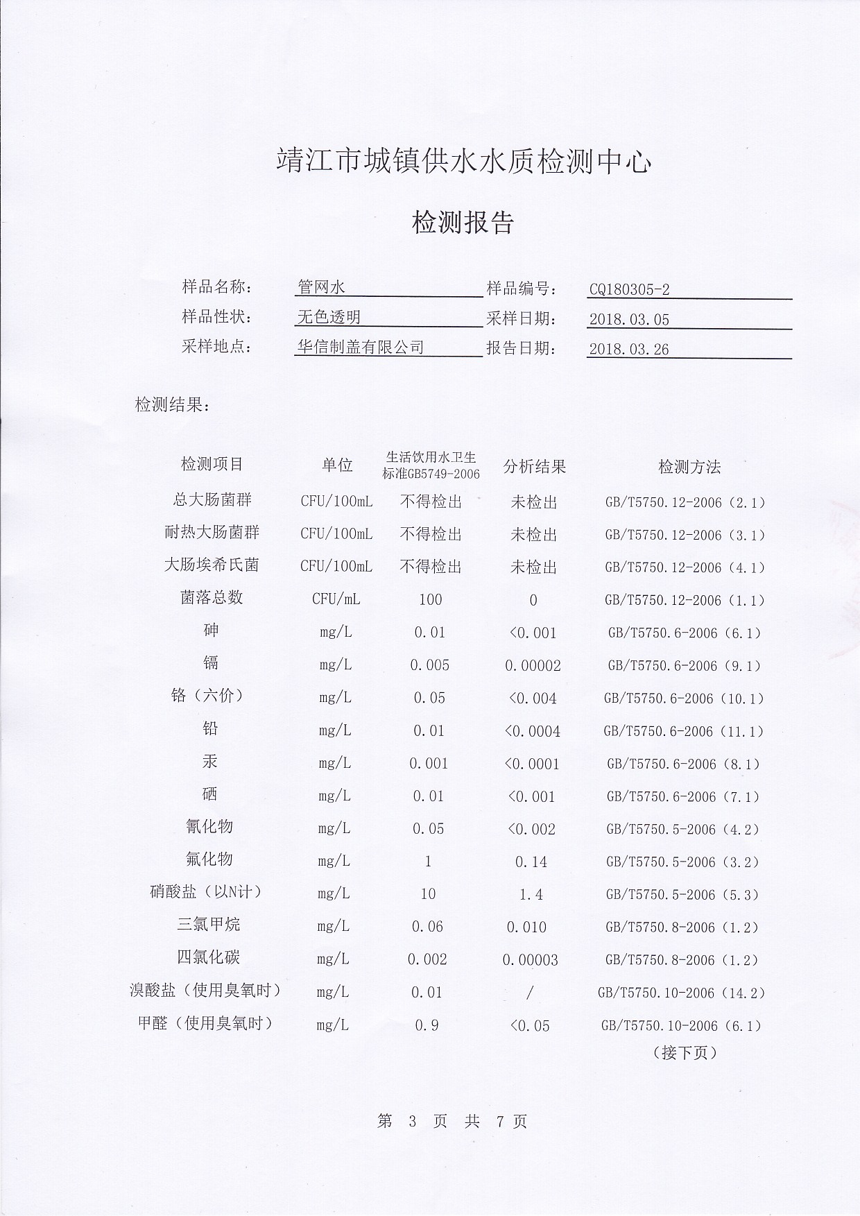 管網(wǎng)水檢測(cè)報(bào)告2018.03.05