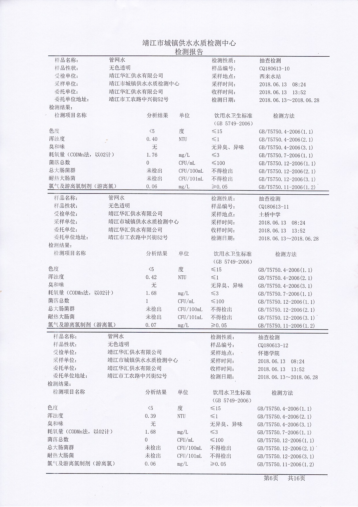 管網(wǎng)水檢測(cè)報(bào)告2018.06.13